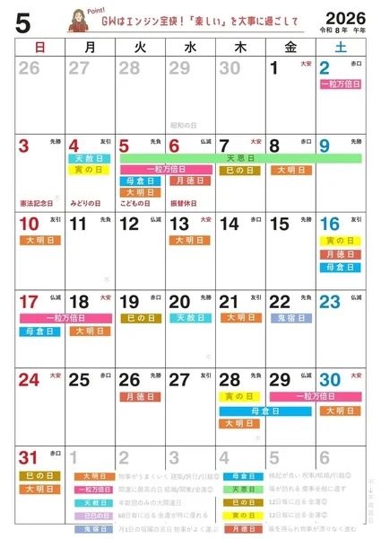 2026年5月の縁起のいい日!開運日・吉日一覧カレンダー連休から始まる5月。休日が多い分「今のままでいいのかな?」と思うことも増えるかもしれません。 そんな … -
