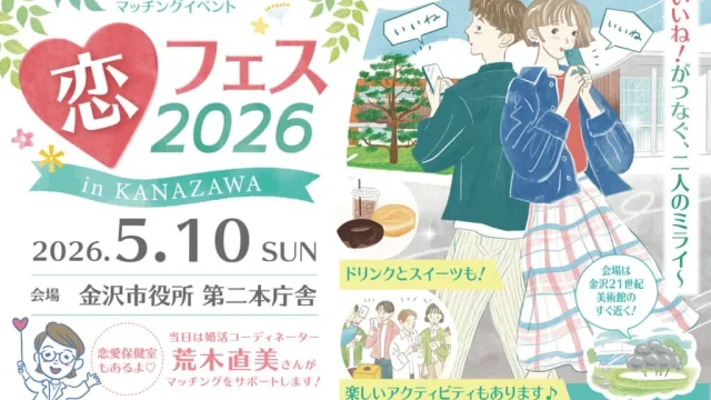昨年、驚異のマッチング率85%を記録し、参加者の満足度も89.3%と大好評を博した金沢市とオミカレによるコラボレーションイベント『恋フェス』が、2026年も開催決定!金沢市役所第二本庁舎を舞台に、100人規模の恋活イベント『恋フェス2026 in KANAZAWA ~いいね!がつなぐ、二人のミライ~』が5月10日(日)に開催されます。婚活コーディネーター荒木直美氏による「荒木メソッド」や専用アプリ「オミカレLive」の導入、地元人気スイーツの提供など、さらに進化したプログラムで、あなたの「推し活」ならぬ「恋活」を全力で応援します!